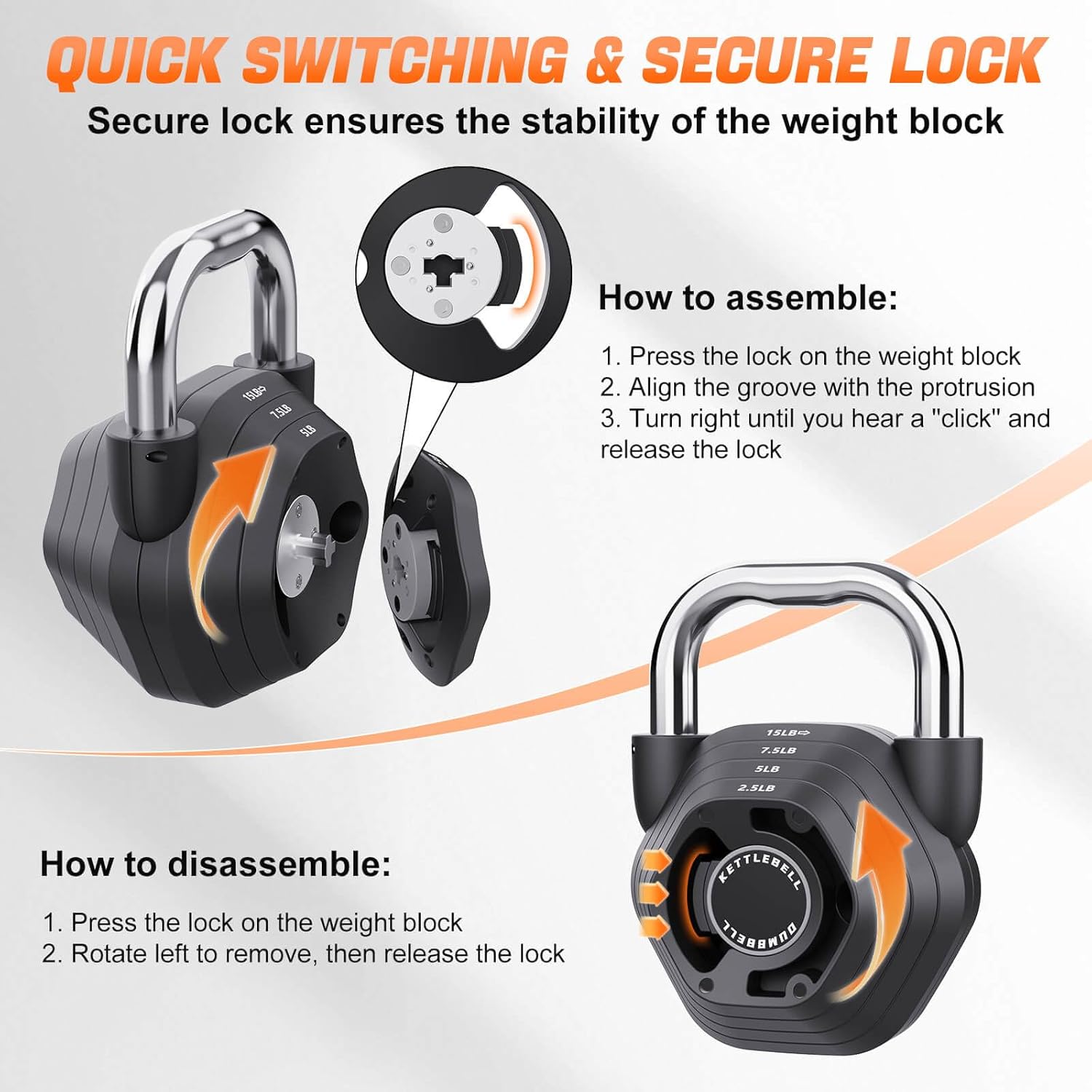 The 2-in-1 multi-functional adjustable kettlebell enables you to easily switch between kettlebells and dumbbells, and you can exercise different parts of your body by adjusting different weights and modes. With a Hamjoiet kettlebell weight set, you can have a compact home gym. Adjustable Weight Kettlebells & Dumbbells By combining weight blocks of different weights, you can get kettlebell sets ranging from 15 to 45LB. With a 0.9LB handle, there is a weights dumbbells set in the weight range of 5.9 to 30.9LB for your choice. Secure &Time-saving Switch When you want to reduce or increase your training weight, simply press the lock on the weight block to make the adjustment. The secure lock of the kettlebell ensures the stability of the weight block during training. Space-saving Hamjoiet adjustable kettlebells set offer a variety of weight options without taking up much space for storage. It is more suitable for small spaces and small gyms than storing multiple kettle bell of fixed weight.
